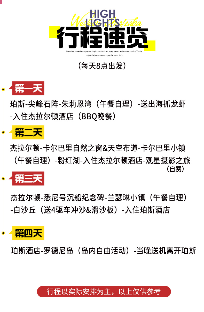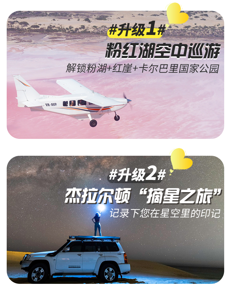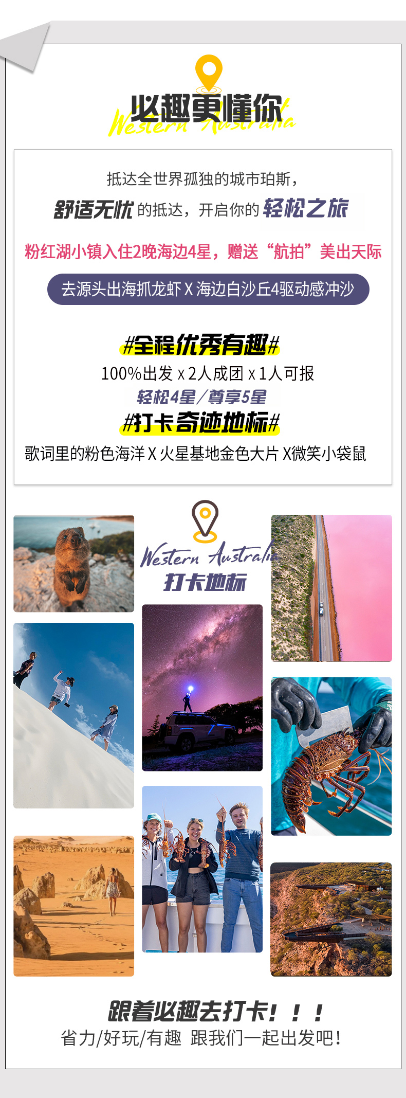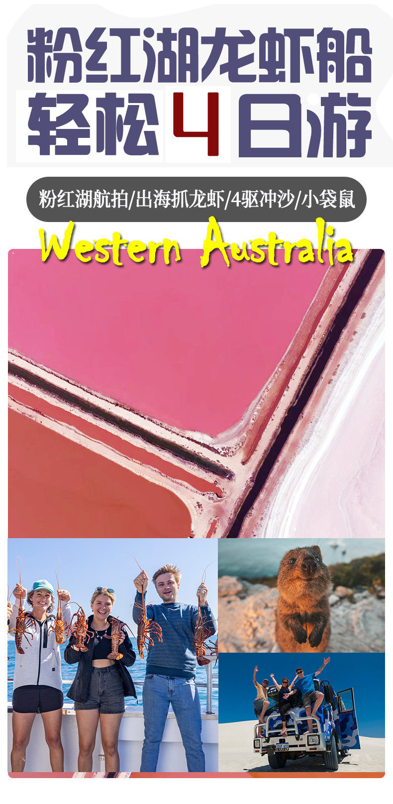 西澳粉红湖龙虾船轻奢4日游(航拍/4驱冲沙/小袋鼠)每周4、7发团/100%出发/2人成团/轻松4星/奢华5星